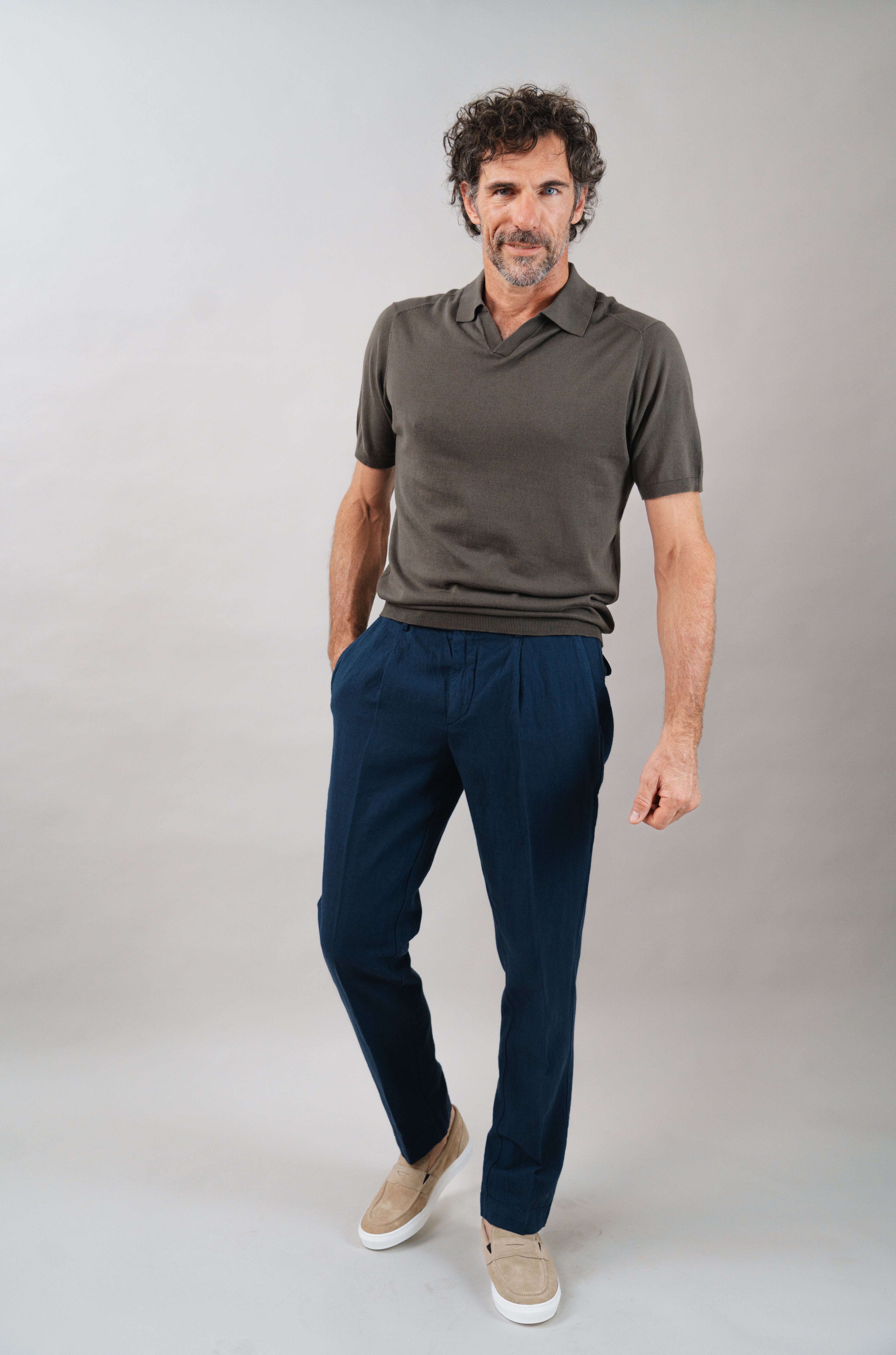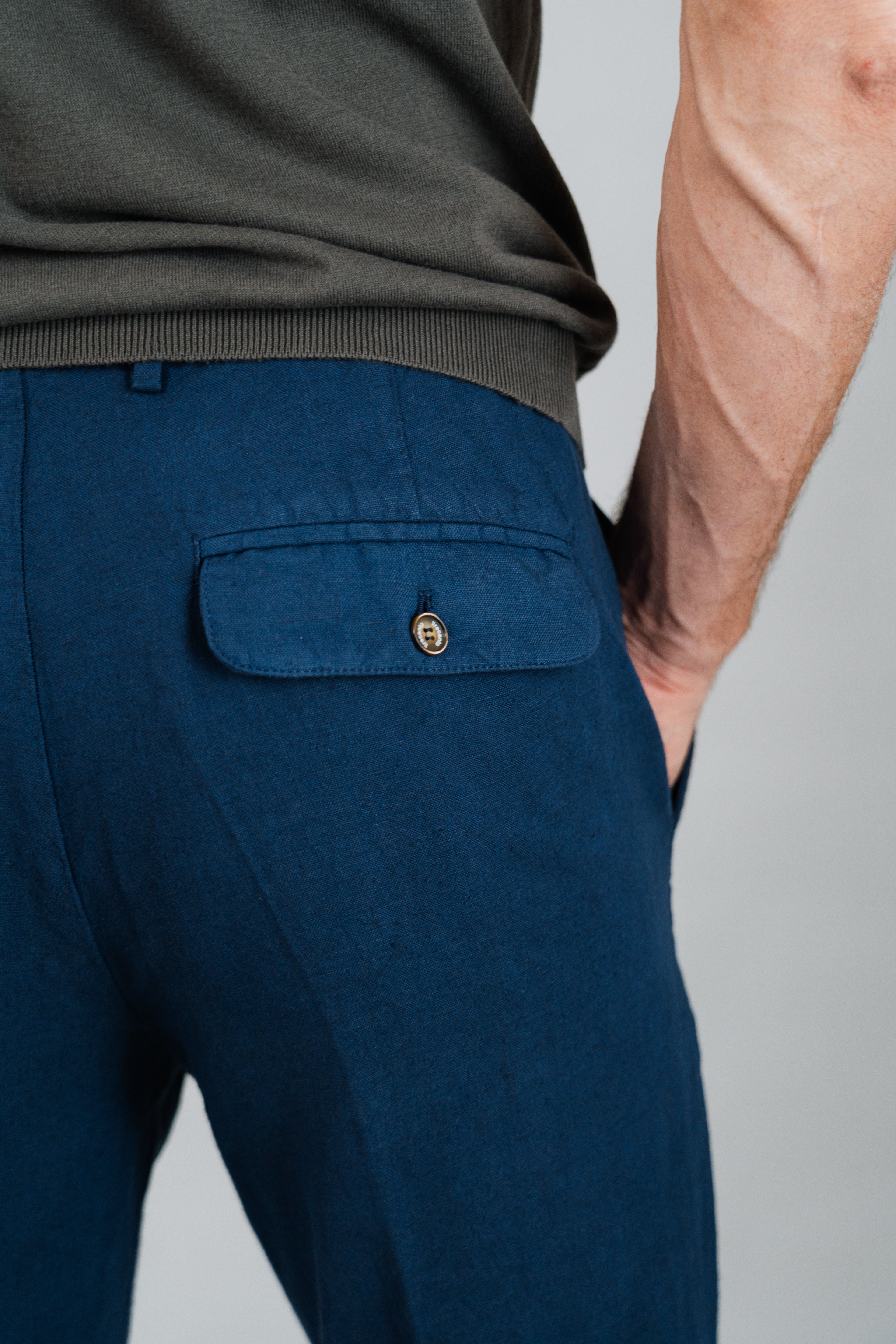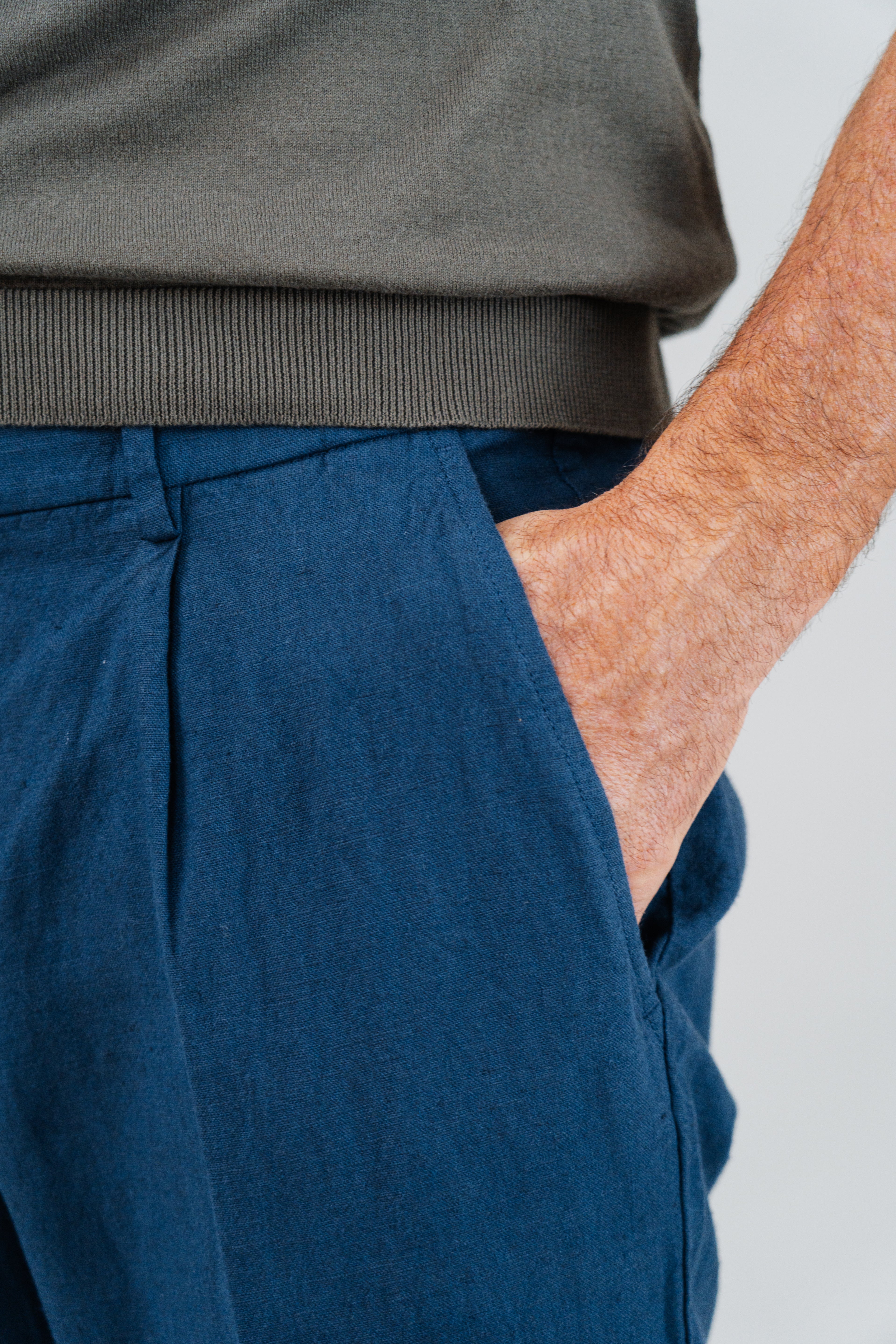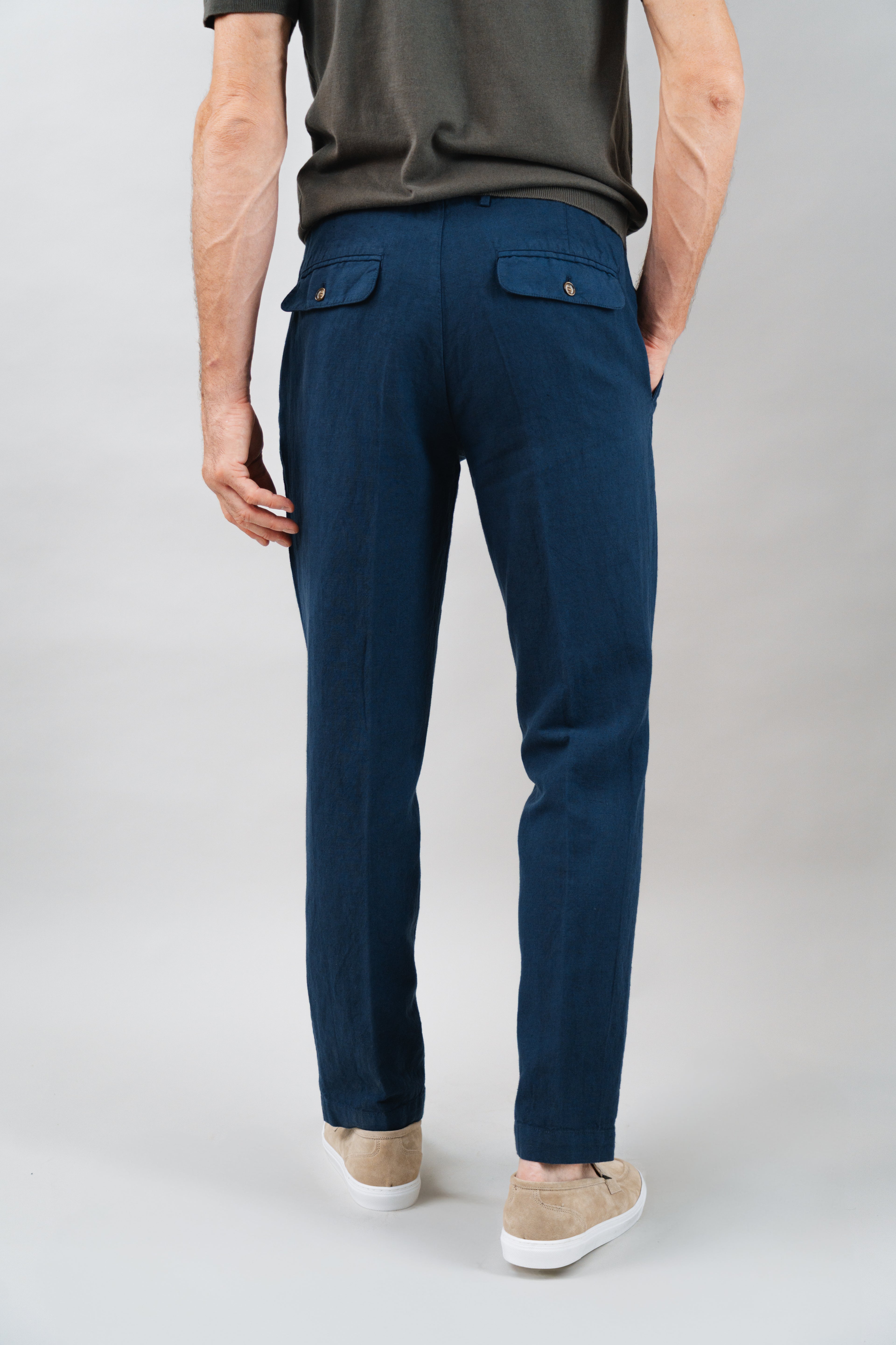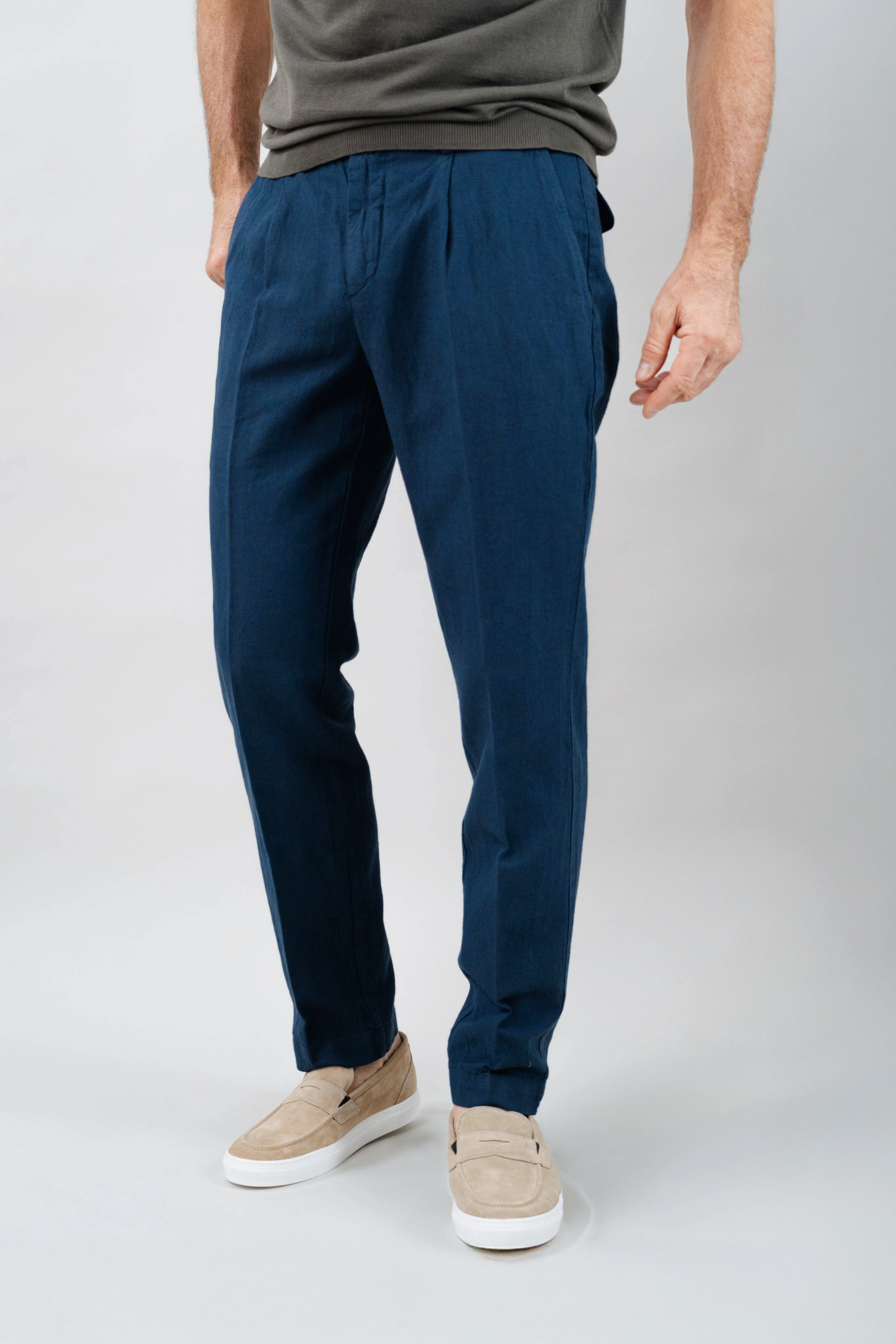 Pantalone chino con pince in lino cotone leggero blu regular fit