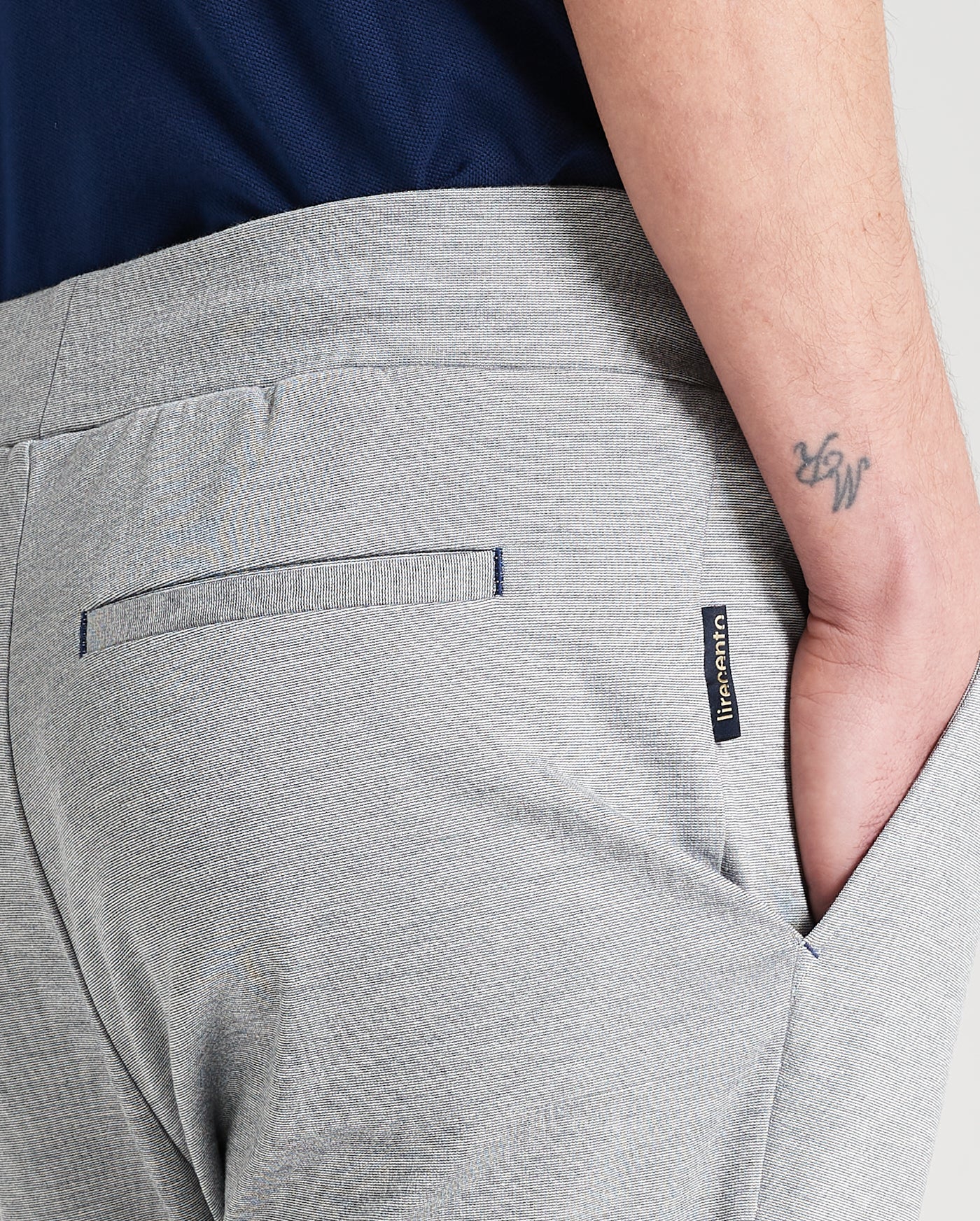 Il Leisure è un modello di pantaloni dal carattere casual, ma sempre curato nel dettaglio. La pince dona un tocco di eleganza ad un pantalone d'ispirazione sportiva, la coulisse interna riesce ad aumentare la sensazione di comfort in chi indossa questi pantaloni, già presente grazie alla vestibilità regular, comoda.