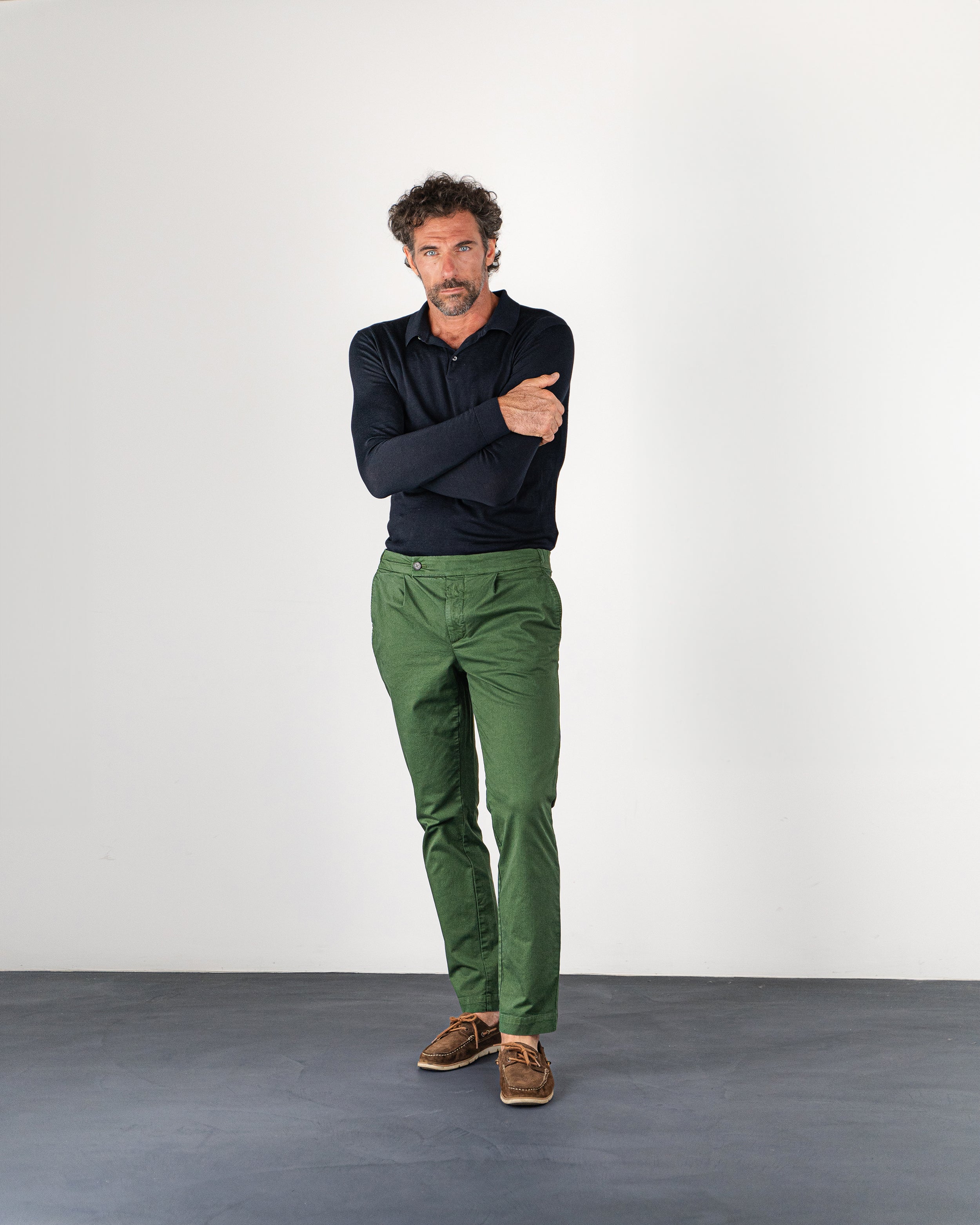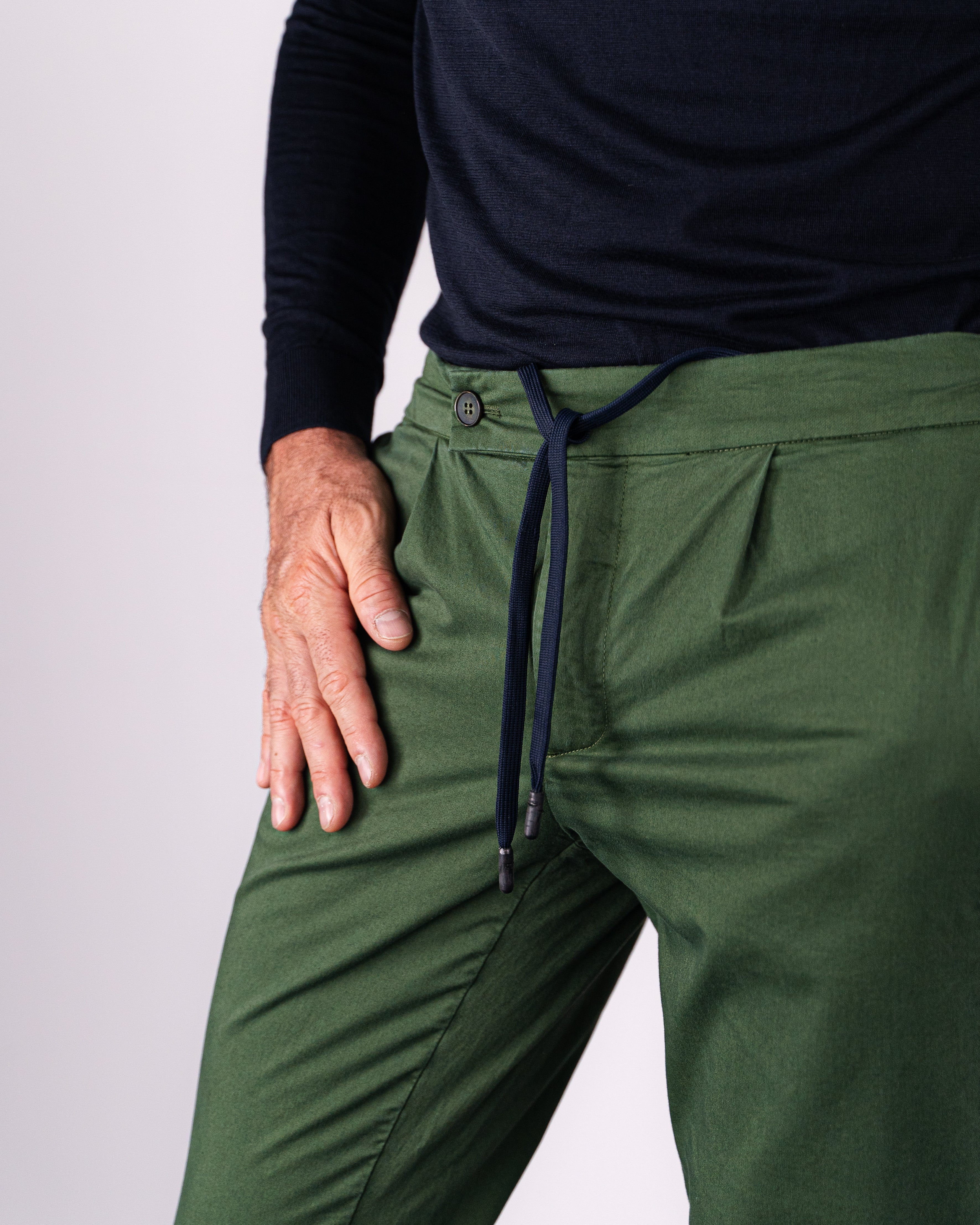 Il Leisure è un modello di pantaloni dal carattere casual, ma sempre curato nel dettaglio. La pince dona un tocco di eleganza ad un pantalone d'ispirazione sportiva, la coulisse interna riesce ad aumentare la sensazione di comfort in chi indossa questi pantaloni, già presente grazie alla vestibilità regular, comoda.