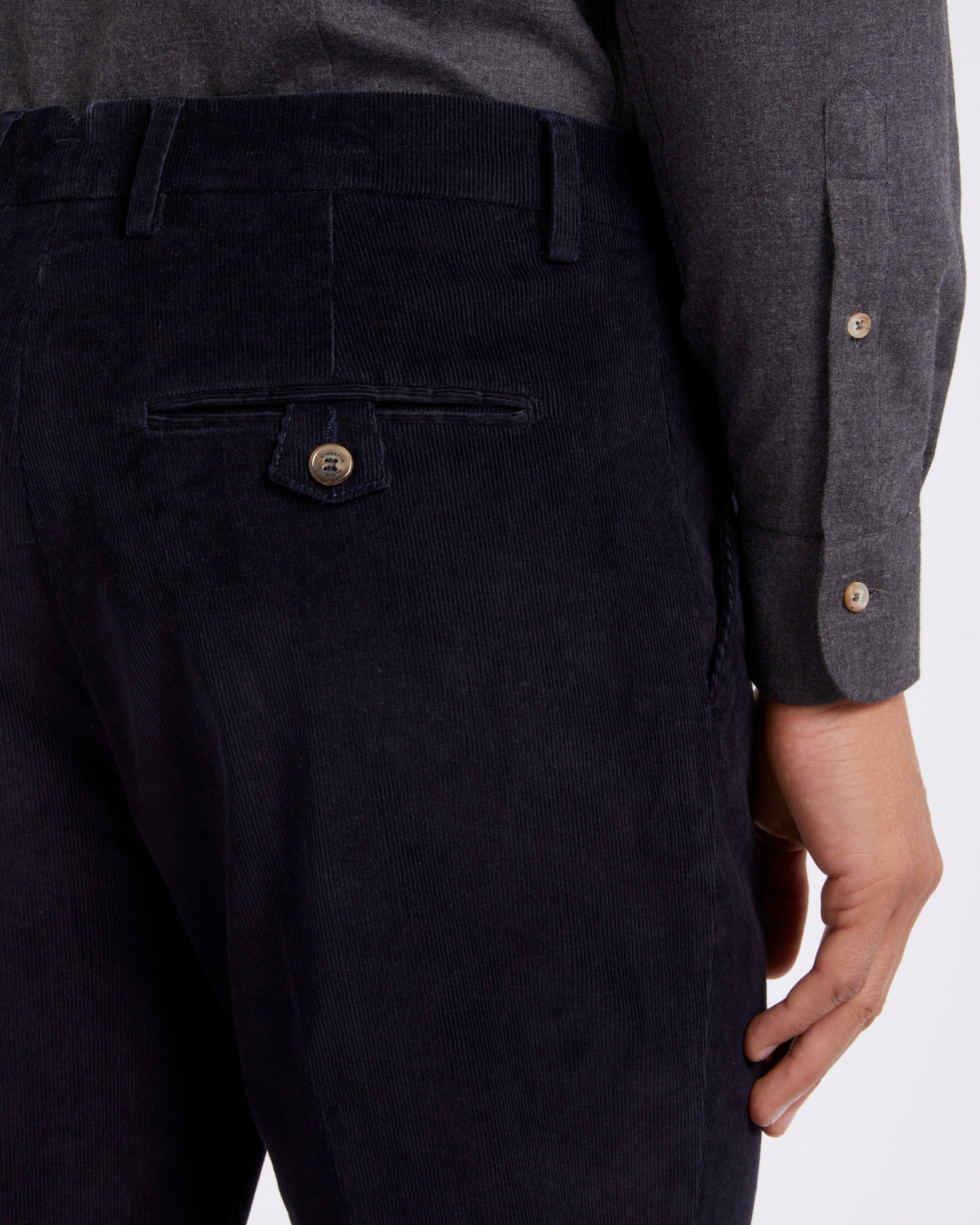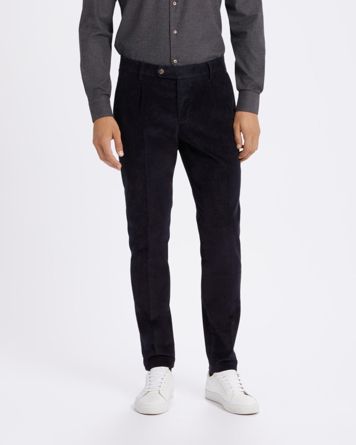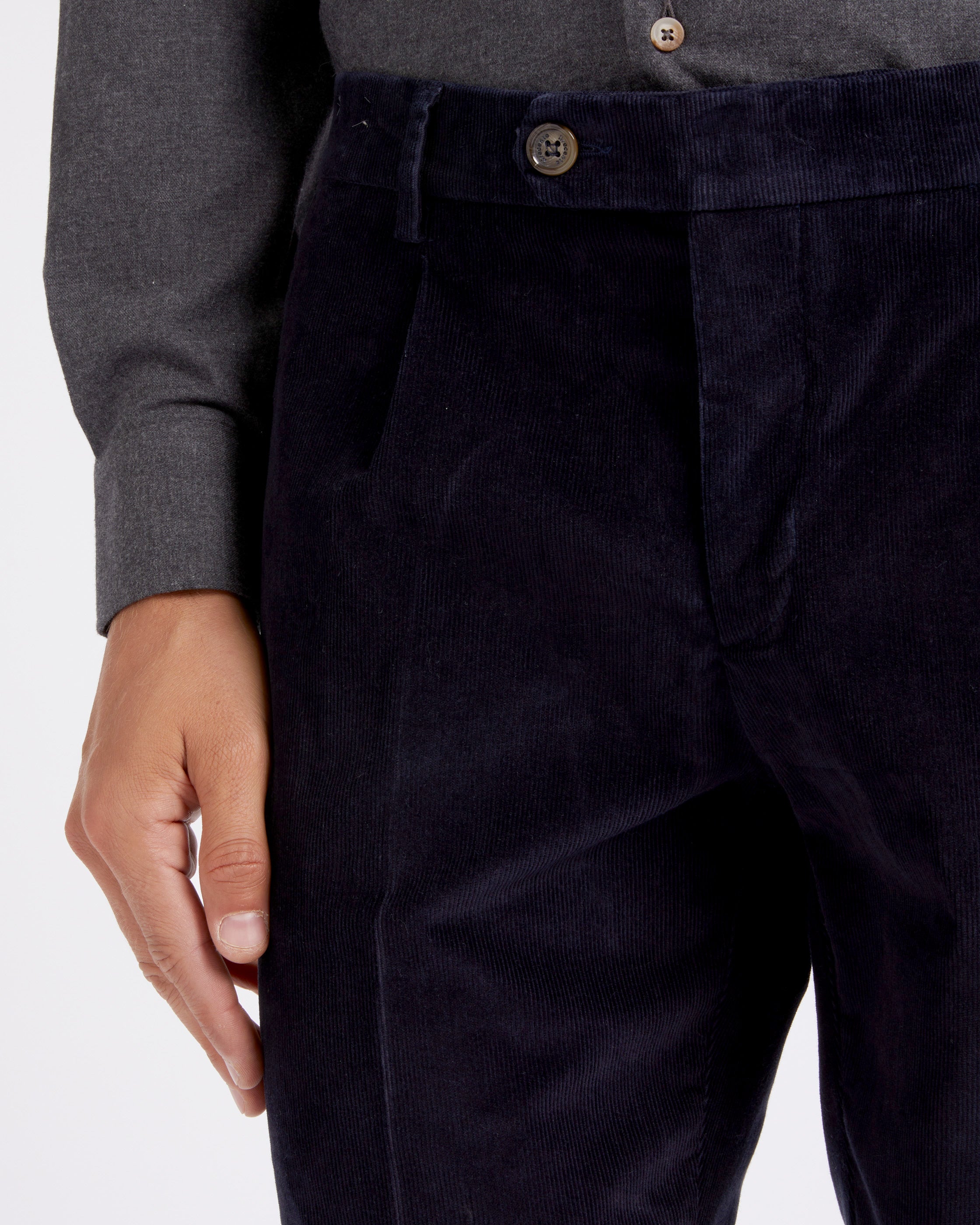 Pantalone chino con pince in velluto millerighe a costa fine pesante blu slim fit