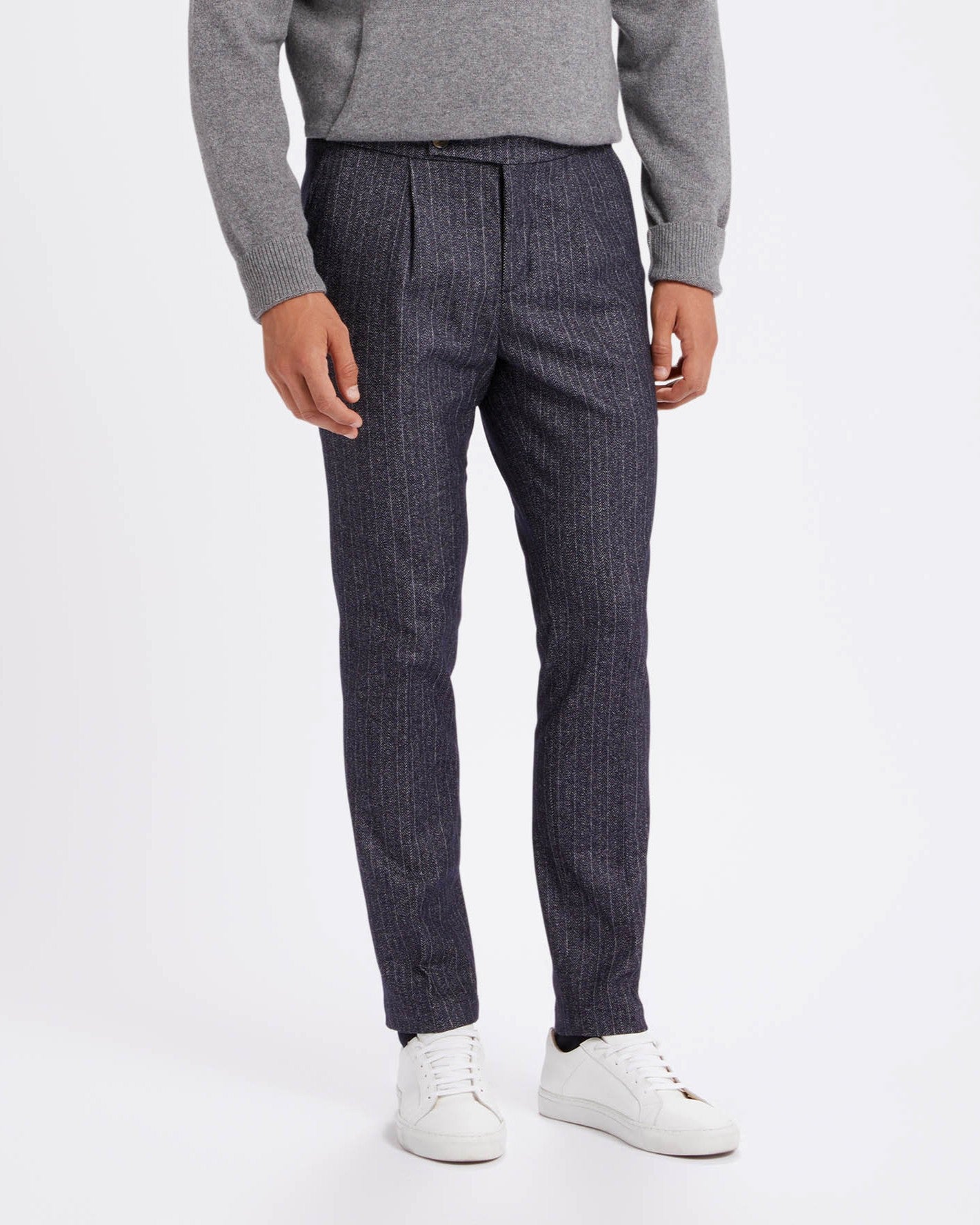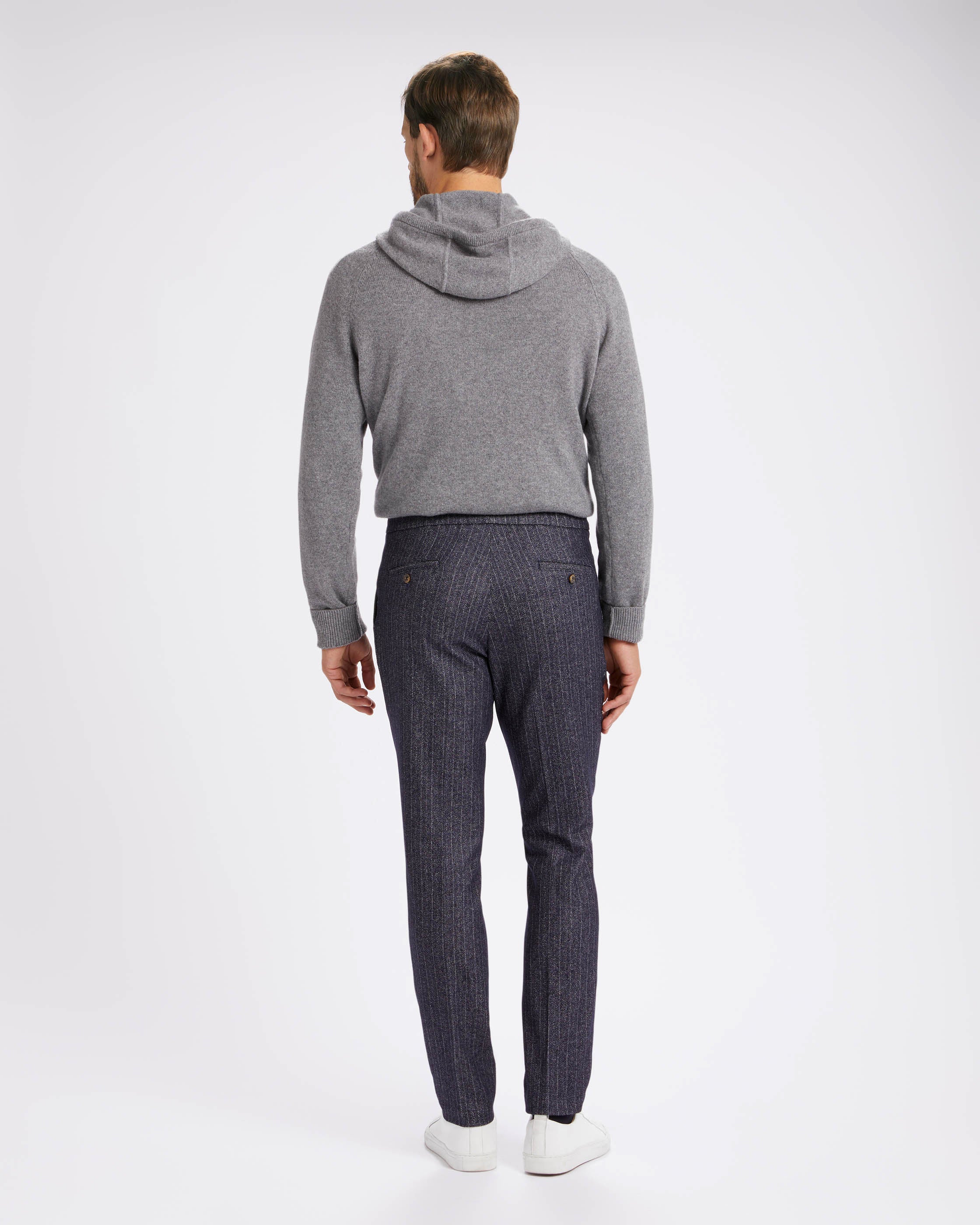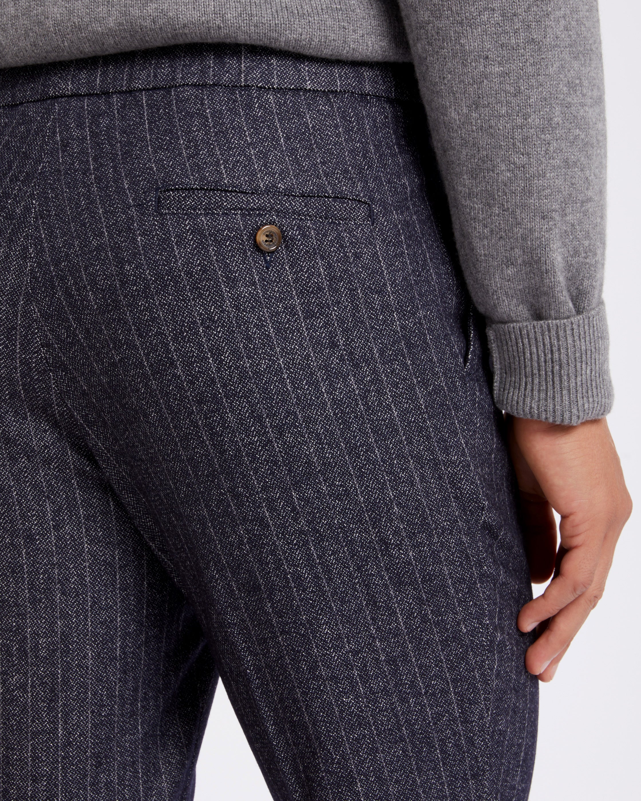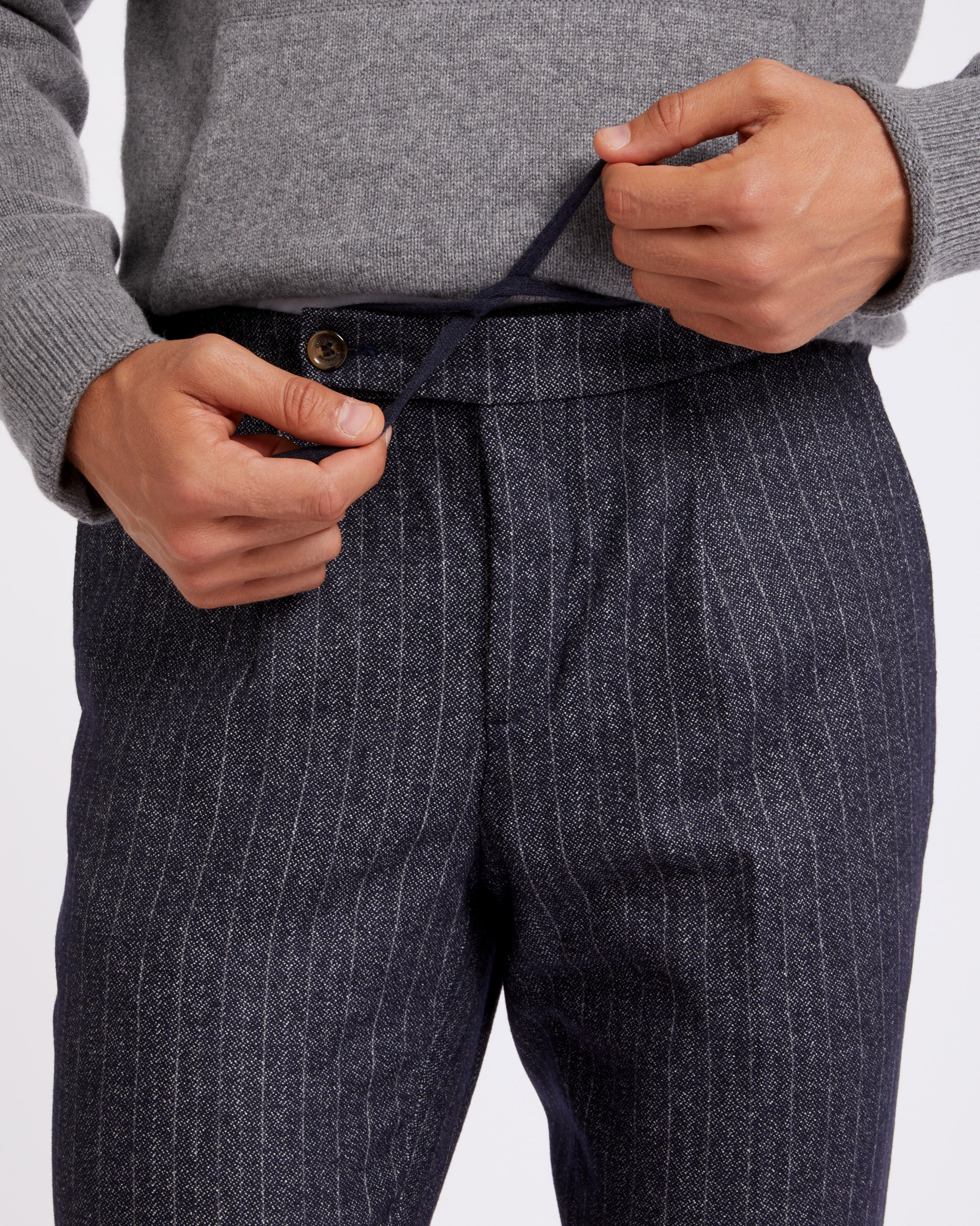 Blue chalk stripe heavy wool drawstring chino trousers straight fit